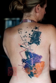 背部吉他碎片和蜘蛛字母彩色泼墨纹身图案
