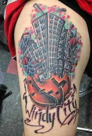 腿部彩色大城市的插画风格纹身图片