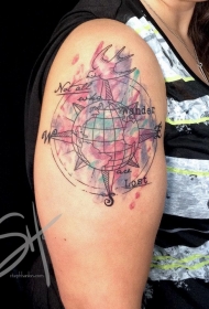 肩部水彩色地球仪纹身图案
