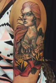 肩部新学校的风格花与女人纹身图案
