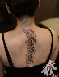 女人后背精美流行的花体字母纹身图片