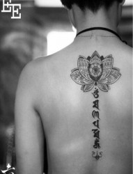 后背流行前卫的梵花六字真言纹身图片
