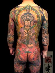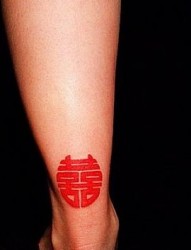 文字纹身图片:腿部彩色图腾双喜文字纹身图案
