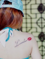 女性后背红唇英文刺青