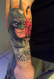 手臂壮观的彩色蝙蝠侠与刻字纹身图片