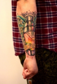 手臂彩色保温瓶与字母纹身图案