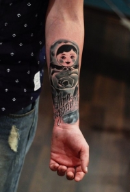 手臂水彩画风格的娃娃与字母纹身图案