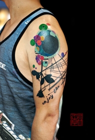手臂线条彩色刺青幻想机器人和刻字纹身图案