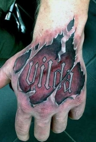 手臂黑色纪念风字母和眼睛翅膀纹身图案