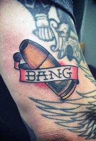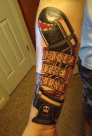 手臂华丽的彩色字母与子弹卡通纹身图案