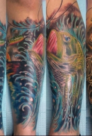 手臂彩色鱼海面与字母纹身图案