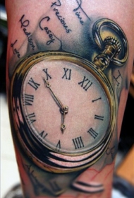 非常逼真的金色怀表与字母手臂纹身图案