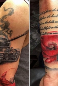 手臂非常逼真的彩色花朵字母和二战坦克纹身图案
