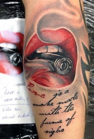 手臂诱人的红色嘴唇与子弹纹身图案