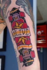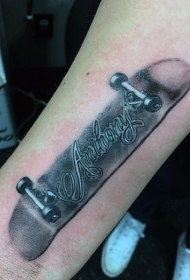 写实的滑板纪念和英文名字手臂纹身图案