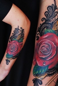 手臂五彩的红玫瑰和蕾丝纹身图案