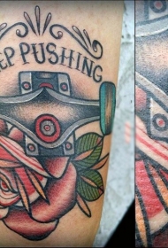 old school彩色滑冰轮子和字母花朵手臂纹身图案