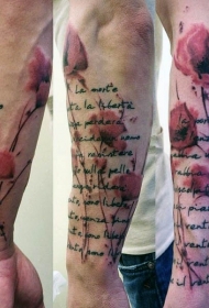 手臂逼真的各色花朵和字母纹身图案