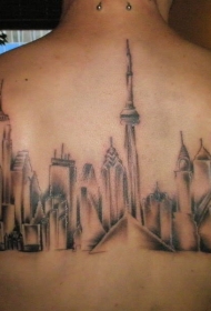 背部黑灰风格骷髅与乌鸦字母纹身图案