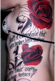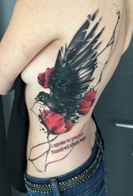 侧肋纪念式的彩绘花朵和字母乌鸦纹身图案
