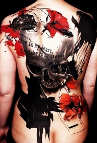 背部巨大的骷髅花朵恐怖风格纹身图案