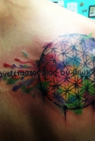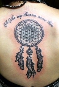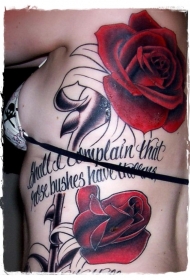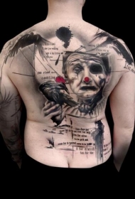 背部彩色的字母与蜘蛛和女子肖像纹身图案