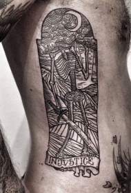 侧肋雕刻风格黑色线条骨架字母纹身图案