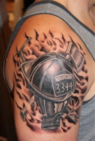 手臂黑灰色的消防员纪念式纹身图案