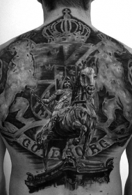 背部写实风格的黑色古罗马雕塑和皇冠纹身图案