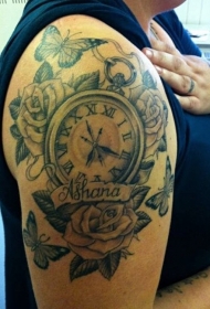 大臂黑色时钟玫瑰字母和蝴蝶纹身图案