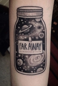 小臂黑色可爱太空瓶和字母纹身图案