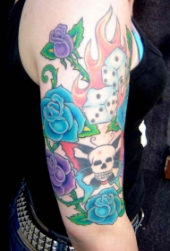 手臂蓝色和紫色的玫瑰与骷髅和骰子纹身图案