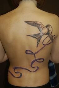 背部燕子与紫色丝带纹身图案