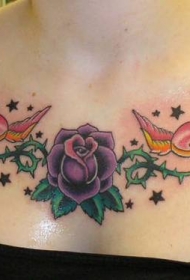 胸部紫色玫瑰与小鸟纹身图案