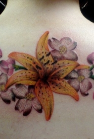 背部彩色的百合花和花蕊纹身图案