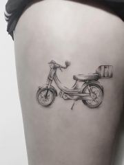 女生大腿上黑灰点刺几何简单线条骷髅和自行车纹身图片