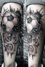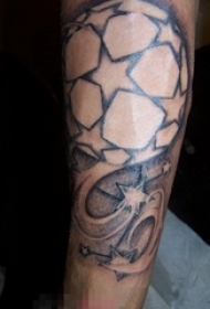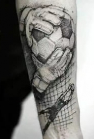 男生手臂上黑色素描点刺技巧足球元素纹身图片