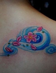 美女背部彩色樱花纹身
