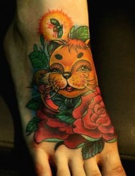女孩子脚背一幅招财猫玫瑰花纹身图片
