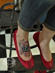 脚背小巧的一幅图腾十字架与蛇纹身图片