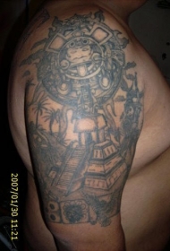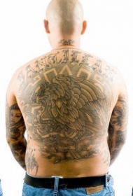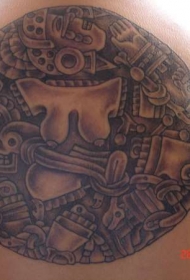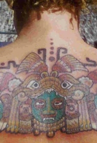 背部色彩缤纷的阿兹特克图腾纹身图案