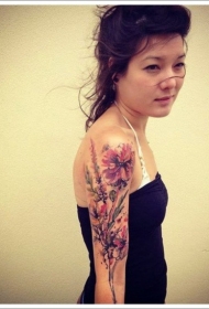 女性肩部水彩花朵纹身图片