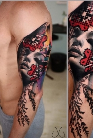 肩部戏剧风格的彩色大乌鸦纹身图案