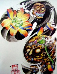 中国新传统之超帅的一幅半甲莲花嘎巴拉纹身手稿图片
