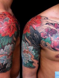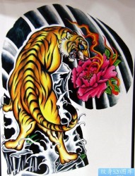 日本男生喜欢的日式老传统超酷半甲牡丹老虎纹身图片