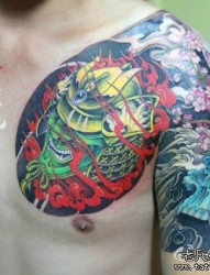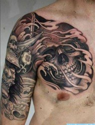 一幅时尚经典的半胛日本武士与骷髅纹身图片