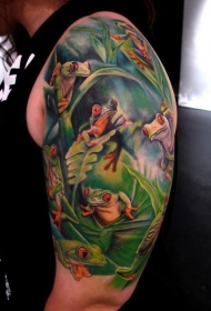 大臂绿色的植物丛林和很多青蛙纹身图案