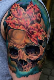 彩色骷髅和枫叶纹身图案
