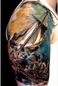 大臂彩色沉船与人像纹身图案