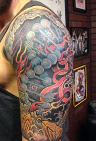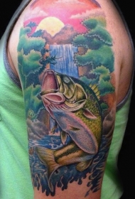 大臂绚丽彩绘鱼和山河纹身图案